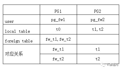 pg1: 建立一個(gè)本地表t0,兩個(gè)外表: fw_t1,fw_t2,分別指向pg2上的t1, t2