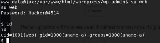 發(fā)現一個用戶叫web,之前wordpress得到一組用戶名密碼就是web的,于是嘗試切換用戶,沒想到成功切換了。(做到這里發(fā)現,之前完全可以通過ssh直接登錄,也就省略了反彈shell的步驟,不過要不是湊巧賬戶密碼一樣也不能成功,所以這里說明賬號口令盡量不要設置成相同口令,然而事實上我們很多口令都是設成一樣的,警示!)
