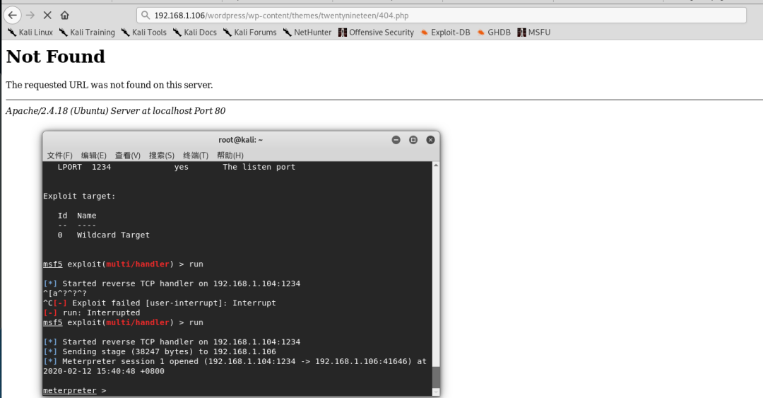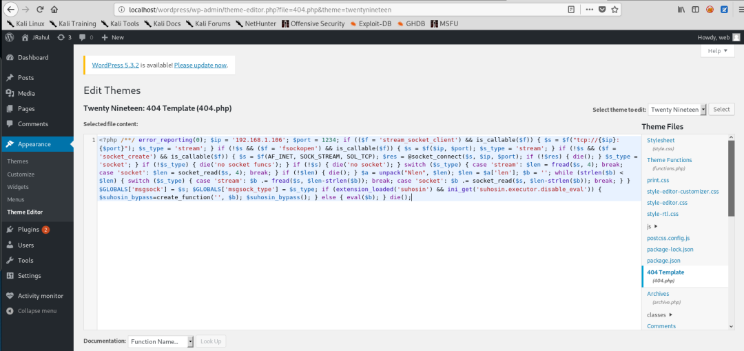 http://192.168.1.106/wordpress/wp-content/themes/twentynineteen/404.php即可反彈shell