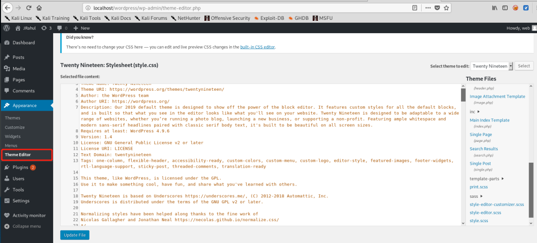 1.是通過Appearance下的themeeditor模塊添加php反彈shell的代碼,再用metasploist監(jiān)聽獲取shell