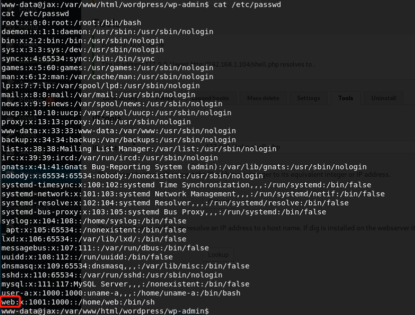 看來這就是wordpress的用戶名密碼了。(其實到這里已經可以走捷徑了,后面提權的時候才發(fā)現,這里可以直接使用ssh登錄進去)登錄進去后發(fā)現該用戶權限挺大的。